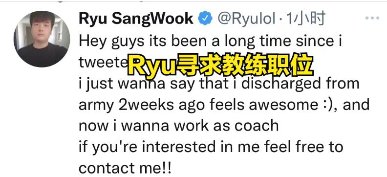 近日,Ryu在发推表示自己在两周前已经服完兵役回来了,如今想要寻找一份教练员的工作,有需要的可以找他。可以看出,Ryu虽然中途因为服兵役的影响,Ryu暂时离开了热爱的事业,但服完兵役归来的他,依然保持着内心那份最真挚的热爱,想要换个岗位继续在喜爱的事业上发光发热。