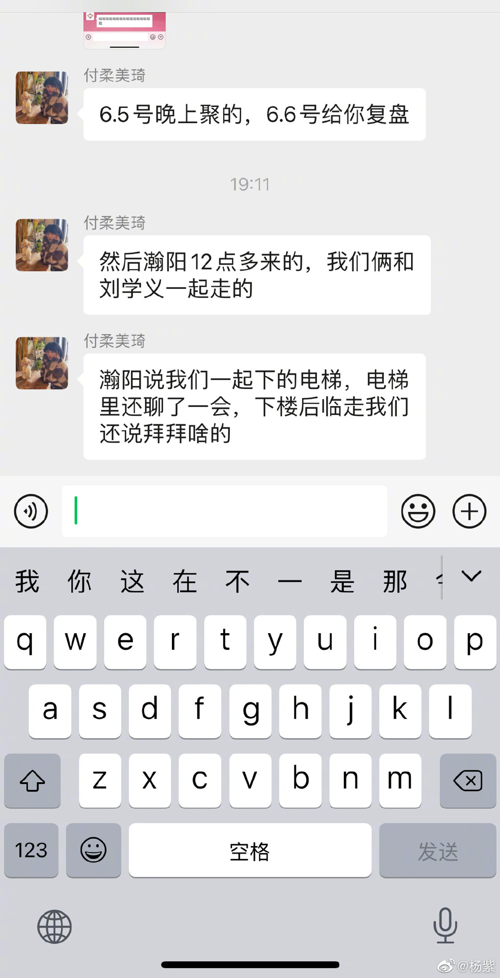 ![]() 对于两个人的关系,杨紫很快发微博澄清,称两个人是十几年的好友,朋友关系而已。原文是这么说的:“我跟学义十多年好友 他生日 一群人一起庆生 8点多去 因为第二天拍戏 11点撤 蛋糕 彼此吃自己的 没有同吃 蛋糕他递过来 是在问我 是不是这个味道难吃 我说对 没有喂我 本是一个简单朋友的生日聚会 不想再复杂 到此为止吧 继续拍戏了 。” ![]() 对于张小寒说的刘学义夜宿杨紫家未归的事,杨紫也给出了证据。