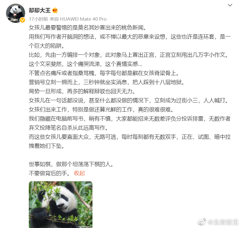2022年8月11日晚,编剧、作家却却发文,疑似为杨紫发声。在文中她写道:女孩儿最要警惕的是莫名其妙冒出来的桃色新闻。用我们写作者开脑洞的想法,或不惮以最大的恶意来设想,这些也许是连环套,是一个巨大的陷阱……女孩儿在一句话都没说,甚至什么都没做的情况下,立刻成为过街小三,人人喊打 。”