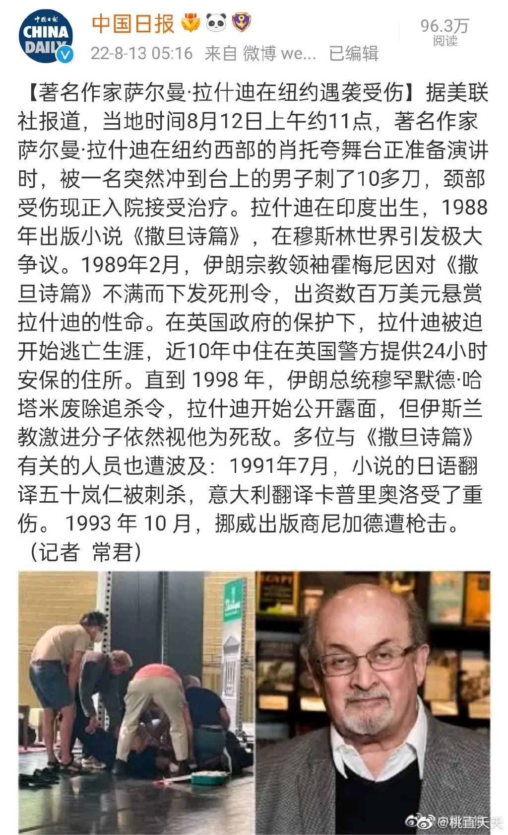 当地时间8月12日上午,著名作家萨尔曼·拉什迪在美国纽约州的一次演讲活动中遇袭。他被捅到颈部,目前已被送往医院救治。袭击者已被捕,目前身份不明。萨尔曼·拉什迪是印度裔英国作家,曾多次获得布克奖。其作品《撒旦诗篇》自1988年起在伊朗被禁,拉什迪也受到人身威胁。拉什迪是1988年写出《撒旦诗篇》的,1989年上了霍梅尼的黑名单的,1998年伊朗领导人废除了黑名单,但架不住狂热的伊朗激进分子一直视他们猎杀对像,这不,终于在昨天又得手了,在他之前,这部书的几个翻译者都被暗杀了.