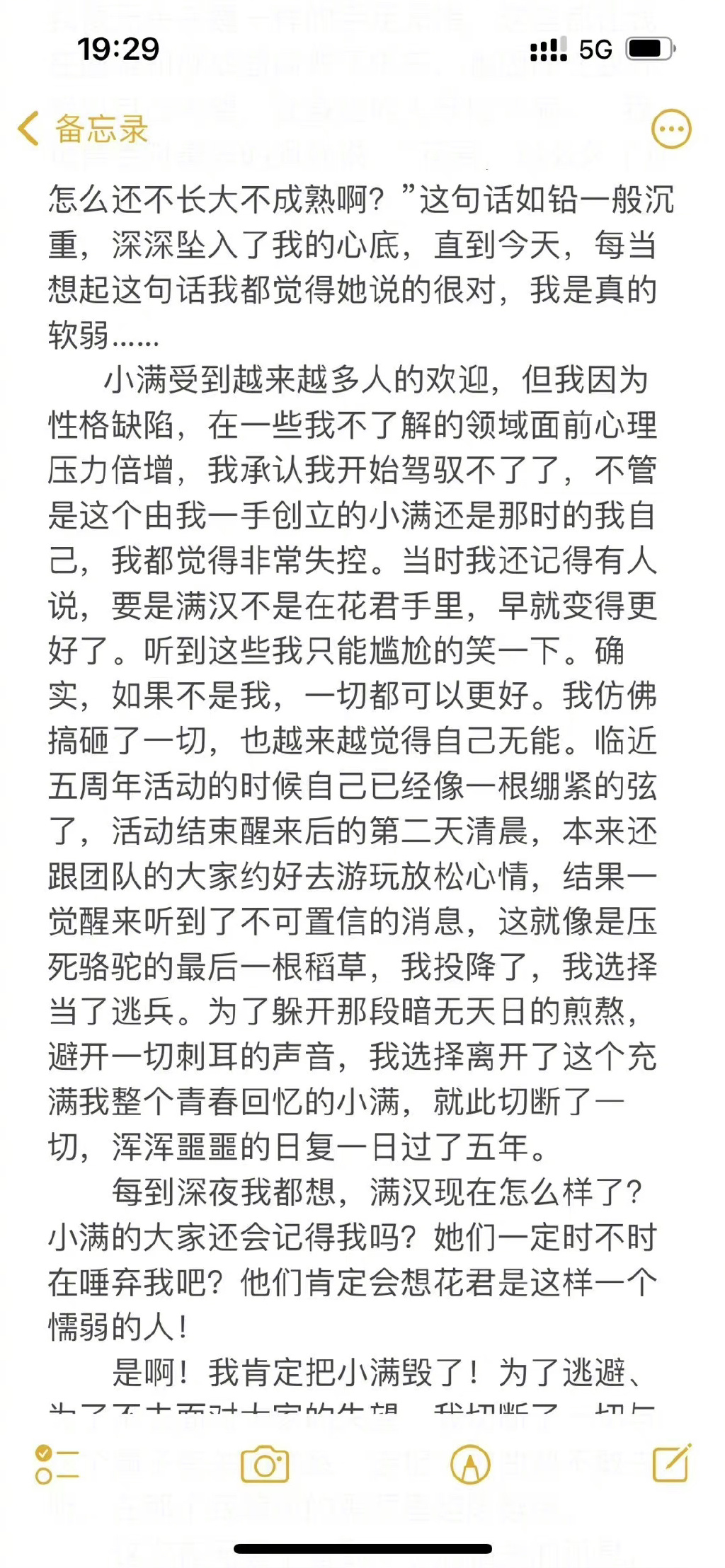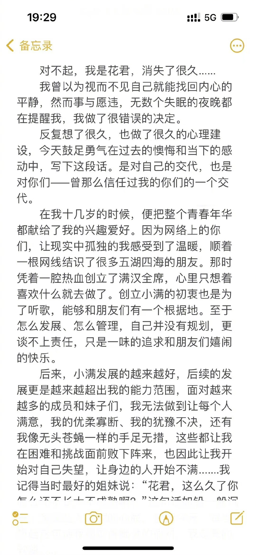 还有消息是说她当年是“卷钱跑路”的,但这件事歌手们都有辟谣,花君当时并没有卷钱,甚至连五周年活动的钱都没拿,随是如此,花君这几年来没少为此被“非议”,作为一个20多岁的小姑娘来说,属实有些难为她了。