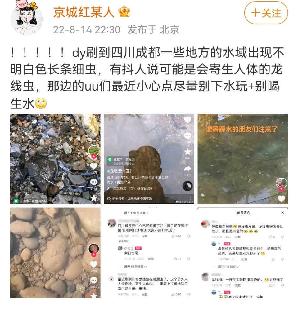 近日,有不少网友发视频称,在成都以及乐山等地河道里,发现一些线虫在水里活动,疑似非洲龙线虫,长度超过十几厘米。成都华希昆虫博物馆馆长赵力表示,这些视频中的线虫并非“龙线虫”,而是昆虫体内寄生的某种线虫,进入了水体。“龙线虫往往是非常罕见的,一般不会在小河沟里随意出现,而这个季节,恰好是螳螂和各种直翅目昆虫进入成熟期,其体内的线虫也发育成熟了,如果在水中发现线虫,不要惊慌,它的寄主一般不会是人类。”