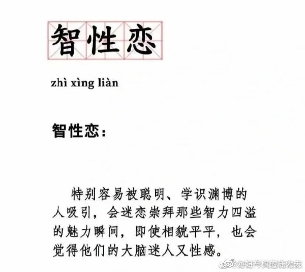 其实智性恋的‘恋’不是崇拜的单恋,而是两个人能产生平等对话。智性恋固然令人心动,但和谐沟通的爱情更值得。面对喜欢的人,无论爱ta的外表还是灵魂,只要彼此喜欢,都不影响亲密关系的建立,都能从亲密关系中找到独属自己的快乐。