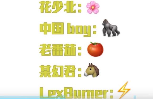 上海ZOO也是“阴阳怪气男团”的前身,区别就是“阴阳怪气男团”加上了@lexBurner 阴阳怪气男团的emoji分别为@花少北:花,@中国boy:猩猩;@老番茄:番茄;@某幻君:马 @lexBurner:闪电。