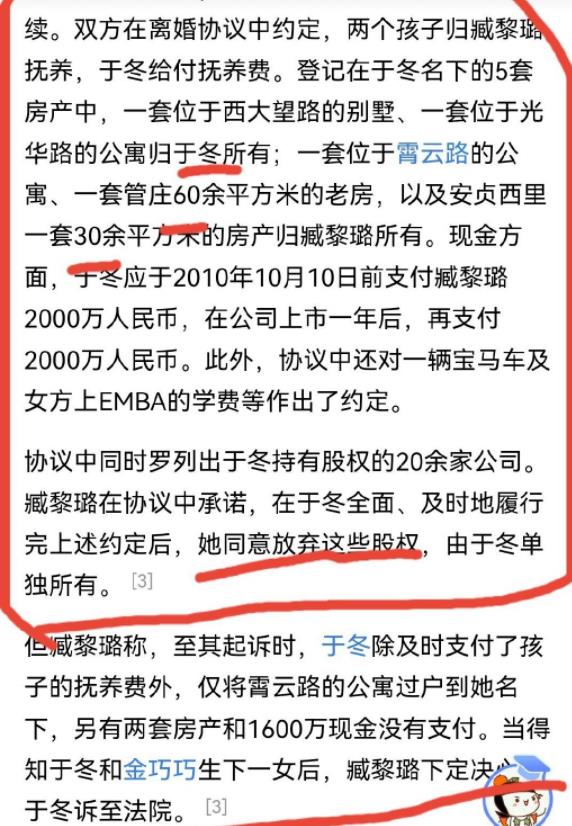 最近,张小寒曝知性女星与已婚富豪在海南某酒店秘密约会引热议,有网友猜测男方是金巧巧老公于冬。晚间,金巧巧 发文辟谣:“谣言止于智者!有空多看电影。不管于东的这次事是不是真的,但是这让不少网友想起了于东的前妻臧黎璐,10多年前,于东和藏黎璐白手起家,一起打拼创建了博纳影业集团,可两人却离了婚,臧黎璐日前还起诉于冬,要求分割上亿的共同财产。面对采访,藏黎璐伤心地说:“接触了演员后,他慢慢变了,不爱回家了。我怀儿子时,凌晨3点有女人一遍遍打电话,说她也怀孕了,是龙凤胎…”