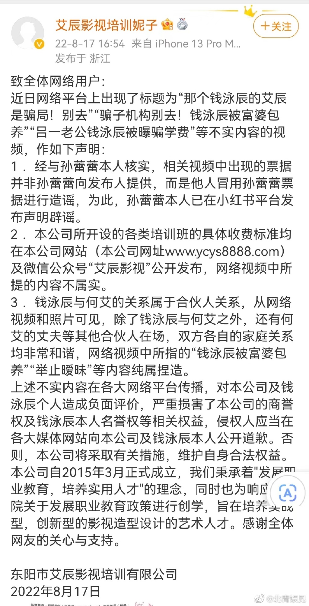 ![]() 虽然,钱泳辰自称为校长,但是他并不是什么影视学校的校长,他只是“艾辰影视培训”机构的负责人而已,而且他这个艾辰培训被曝光有很大的问题。 某去过他们公司培训的学员表示:“事情大概就是去他们这里先要交五千定金和十万学费,然后去那学了之后呢,这个机构会安排有的学员去陪他们喝酒,说是什么安排资源,其实这个钱泳辰是个拉pt的,怂恿学员去献身导演,因为我不同意想要退出这个机构,但是钱他们不给退回来,钱泳辰自己被富P by,艾是富P,辰就他自己...”(目前该网友的言论未得到证实,艾辰方面也已经给出了严正声明) 根据这个学员的说法来看,钱泳辰不是什么隐形富豪... ![]() 对于被曝光钱泳辰和何艾的暧昧关系,艾辰培训在8月17日也迅速发布声明,称他们只是合作关系,各自有各自的家庭,详情如下,对于造谣者,艾辰影视也已经报案。 ![]()