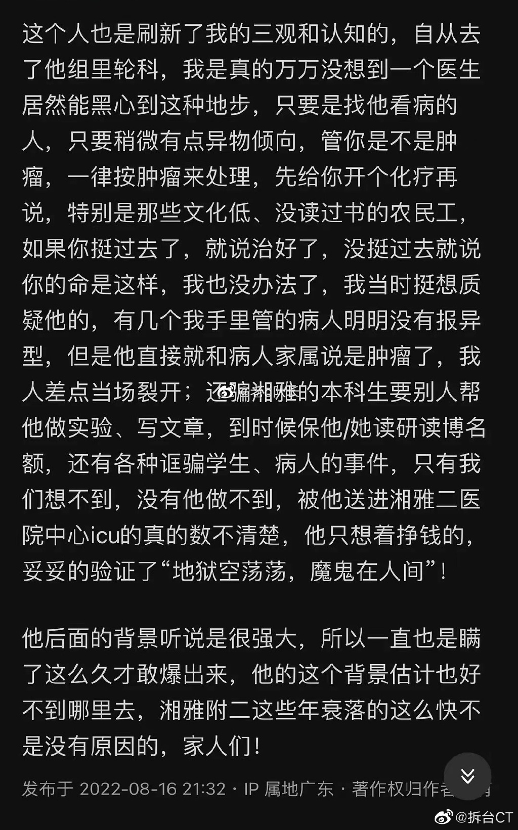 当然,关于 “湘雅二院刘翔峰”事件,我觉得现在都别说得太早,因为基本上没有实质上的报道,都是些网络爆料,所以如果随意妄加定论或会翻车的。剧情反转的例子已经有不少,不实的爆料 网传等等,损坏了她人名誉,导致造成她人影响。现在这起事件已经被关注上了。长沙湘雅二院回应网传医生作风问题。信息点:1,已停职。2,正接受调查。3,调查结果“到时候会有一个交代”。所以等调查结果出来吧!调查结果通报出来了才是铁一般的答案。如果事实存在了,会有法律给我们去处理! ![]() 2022年8月23日,媒体联系了刘翔峰,他拒绝对网络流言做出评论,“如果有任何问题,请直接联系我们医院的宣传部门。