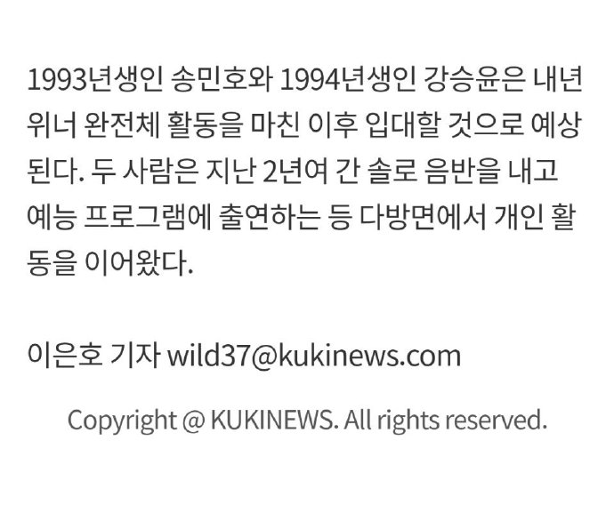 ![]() 对于姜昇润恋爱,大部分网友理解,并支持,毕竟快三十了,谈个恋爱正常,出道也八年了,谈就谈呗,Jennie刚出道都谈好几个了,前辈师兄现在谈一个过分吗? ![]() 此外,有新闻报道说28岁的姜昇润今年就会入伍,在WINNER完整体活动结束后入伍。 新闻说的是“预计”&“2022年完整体活动结束后入伍”,大家对于“2022年”的确都比较惊讶,但新闻写的是“预计”,且并没有明确“一起入伍”,我觉得可以适当做心理准备,但暂时不要产生过多的联想和担忧. 韩国现行兵役法规定28岁前入伍,不过竞赛冠军等可以延期到30岁。韩国国会议员全容基今天提交了关于修改大众文化艺术人参军年龄限制的修订案,主张将延期参军范围扩大到大众文化艺术领域,让那些为提高国家知名度和影响力做出贡献的偶像艺人也可以延期到30岁参军。 也就是说留给姜昇润入伍前的时间不多了,他已经28岁了,最迟明年(2023)或者后年(2024)必须入伍。 ![]() |