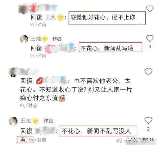 ![]() 杜志国情史十分丰富,有过三任妻子,第一任妻子便是杜淳的妈妈杨丽,第二任妻子是赵娜,第三任妻子也就是现任妻子郑卫莉。 ![]() 网上流传杜淳很花心,可能是随了老爸,前后有5任女朋友,基本都是无缝衔接,在跟王灿结婚后,有网友曾给王灿留言说:“杜淳看上去就很花心。” 对此,王灿表示“不花心,新闻不乱写就没人看啦”。 ![]() 据说,王灿与杜淳结婚后,婆婆杨丽就特意嘱咐她要时刻盯着杜淳,即便在外面拍戏工作也要跟在身边。本是婆婆对儿媳的叮嘱,却让人看着心酸。