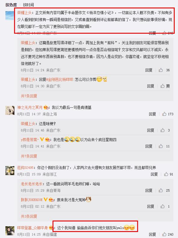 而在8月11日,张小寒也表示爆料的瓜不是杨洋 ![]() 杨洋的感情状态一直很稳定,那就是单身,只不过因为杨洋是顶流,网络上流传各种关于他的瓜,别人恋情都是直接甩证据,杨洋恋情全靠yxh一张嘴编。每次杨洋有剧有资源的时候就开始胡编乱造了,而且话题一个比一个劲爆,但是杨洋和其团队基本不太回应这些虚假的事。 ![]() 网络上还有粉丝会写一些关于杨洋恋情的小作文,一些不明真相的人以为是真的,其实都是粉丝们yy的,最终大家都知道,他的女朋友是ymls(杨洋粉丝的别称,即羊毛老师)。 下面是《杨洋恋情小记》:
