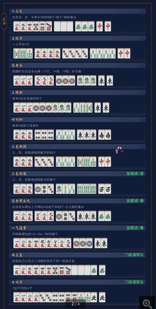 31、全带五每副牌及将牌必须有5的序数牌。不计断幺32、三同刻3个序数相同的刻子(杠)。