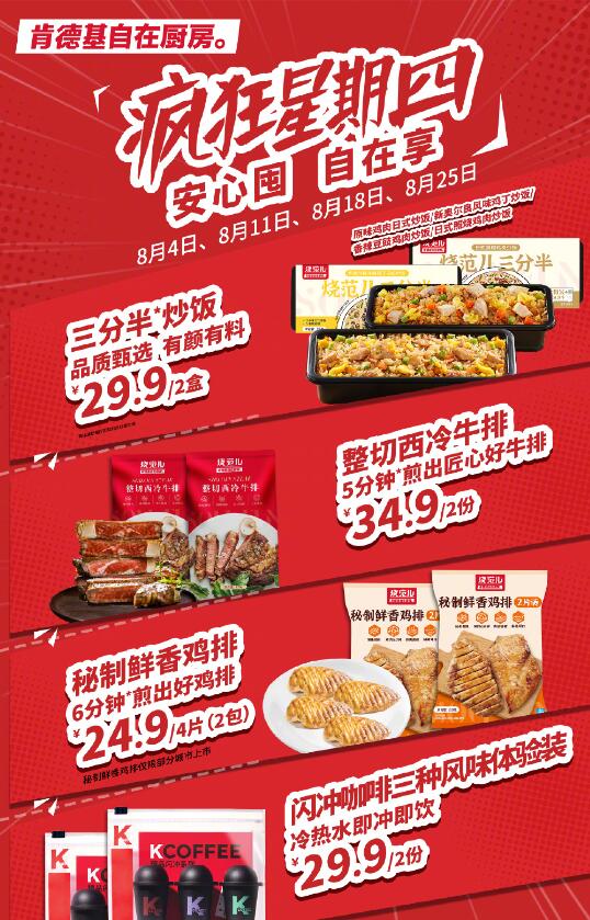 本来扑朔迷离的文案,看到最后才发现原来是“肯德基疯狂星期四”的搞笑营销文。 ![]() 被网友疯狂热炒的肯德基疯狂星期四活动规则是活动时间为9:30-23:00,武汉市、广东省及福建省为10:30-23:00,肯德基会发通告不同月份都有不同的活动内容,比如在8月份的每个星期四(即:8月4日、8月11日、8月18日、8月25日)活动内容如下图。 主要包含:烧范儿三分半,微波叮出自在一餐;整切西冷牛排,宅家5分钟拥有西餐厅的仪式感!秘制鲜香鸡排,煎6分钟入口弹嫩多汁;闪冲咖啡即冲即饮打工人下午续命! ![]() |