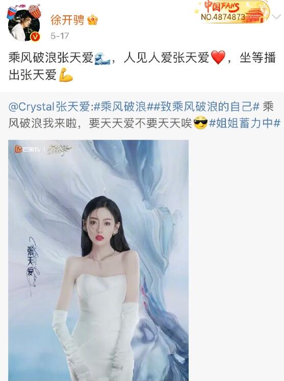 5、2022年5月17日,徐开骋转发张天爱参加浪姐的官宣微博为其打call