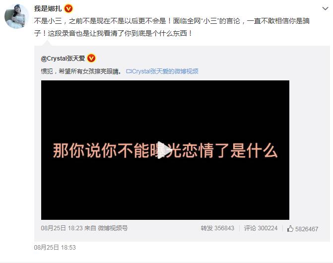 13、8月25日,娜扎转发张天爱微博,“不是小三,之前不是现在不是以后更不会是!面临全网“小三”的言论,一直不敢相信你是骗子!这段录音也是让我看清了你到底是个什么东西!”