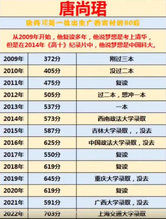 公开资料显示,唐尚珺出生于广西,2009年首次参加高考,分数并不理想,其后开启漫漫复读路,目标直指清华大学。2014到2016年,唐尚珺的同学何汉立跟踪拍摄了他的日常生活,创作纪录片《高十》,将唐尚珺进一步推向公众视野。复读十多年间,他曾被西南政法大学、吉林大学、中国政法大学、广西大学等录取,但均未就读。