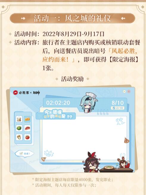 “风起必胜,应约而来”是最近《元神》与“必胜客”的联动活动,继之前《元神》与“肯德基”异世相遇,尽享社死以后,米哈游又与必胜客餐厅为玩家推出了新一轮社死套餐。据说只要前往主题店购买套餐以后,对店员喊出“风起必胜!应约而来!”即可获得限定海报。