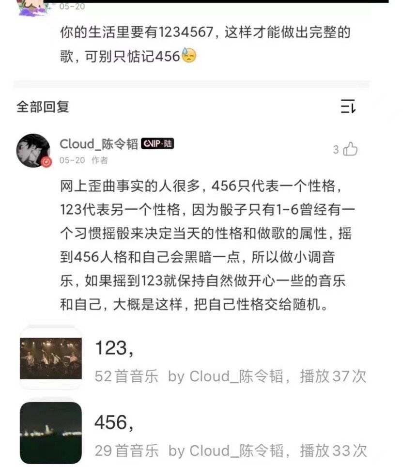 之前陈令韬就曾解释过“456”,他说“ 网上歪曲事实的人很多,456只代表一个性格,123代表另一个性格,因为骰子只有1-6曾经有一个习惯摇股来决定当天的性格和做歌的属性,摇到456人格和自己会黑暗一点,所以做小调音乐,如果摇到123就保持自然做开心一些的音乐和自己,大概是这样,把自己性格交给随机。”