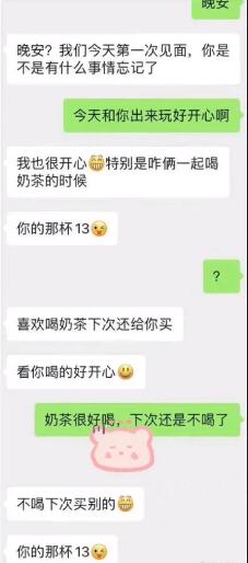 男生说“我也很开心,特别是咱俩一起喝奶茶的时候,你的那杯13”“喜欢喝奶茶下次还给你买,看你喝的好开心”