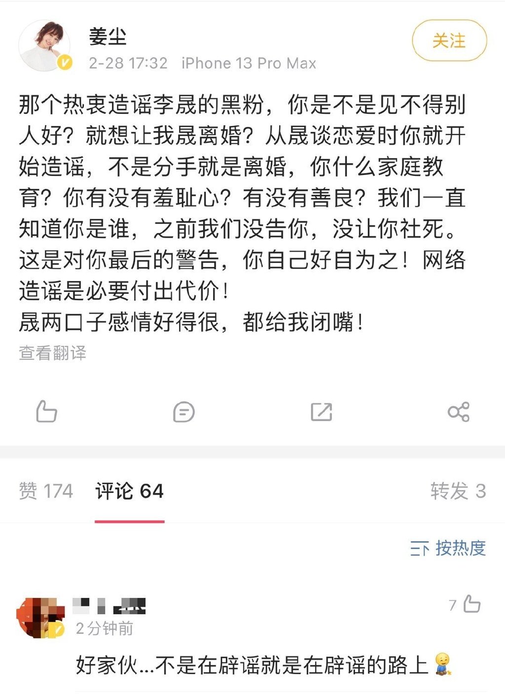 ![]() 李晟和李佳航在2011年因为拍摄《新还珠格格》结缘,然后在2015年正式结婚,目前两个人的婚姻已经走过了7年之痒,网络上关于两个人离婚、婚变的消息一直不断,但是他们小两口总能用实际行动证明“婚变谎言”。 网络上还有一个专门的黑粉,通过P图,造谣的方式来宣传2个人离婚,比如下面这张图(冒充李晟的闺蜜姜尘,后来被姜尘辟谣) ![]() 对此,李晟出来辟谣了自己和老公李佳航的离婚传闻:“图是假的,闺蜜没发,感情很好。 ”