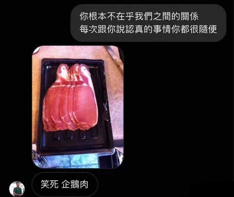 女生很严肃的在讨论两个人的感情问题,结果男方根本没有再听,而是发了一张酷似企鹅形状肉切片照片,说了一句“笑死 企鹅肉”