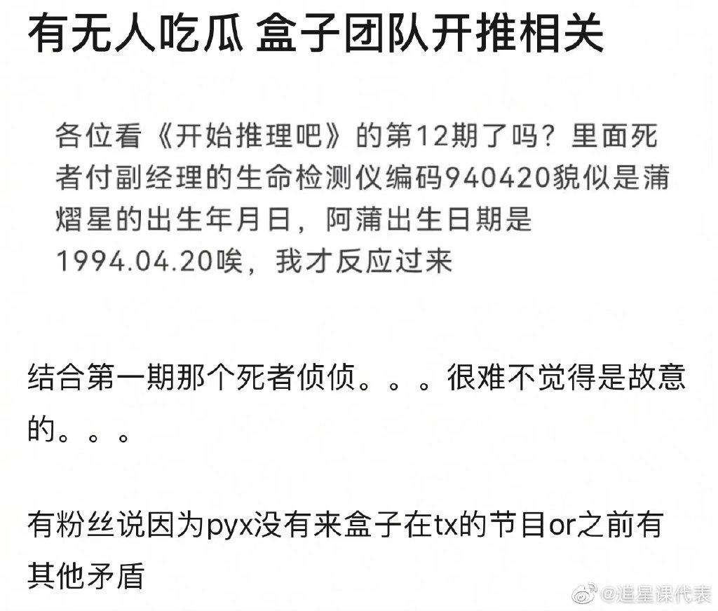 ![]() 整体来说,小盒子团队还是有点东西的,说实话制作的推理类综艺水平的确很高,脑洞,逻辑,推理和严谨占大头,而不是全是娱乐。而且我个人认为职场上为更大的利益跳槽太常见了。只是从情感角度来看,看鹅厂的新综艺里面处处都是明侦的影子,的确不太舒服,明侦粉看第一个案件的时候,的确没有太大惊喜,总让我想起夜半酒店... 但是,希望你们以后别总内涵人了,很不好! ![]() |