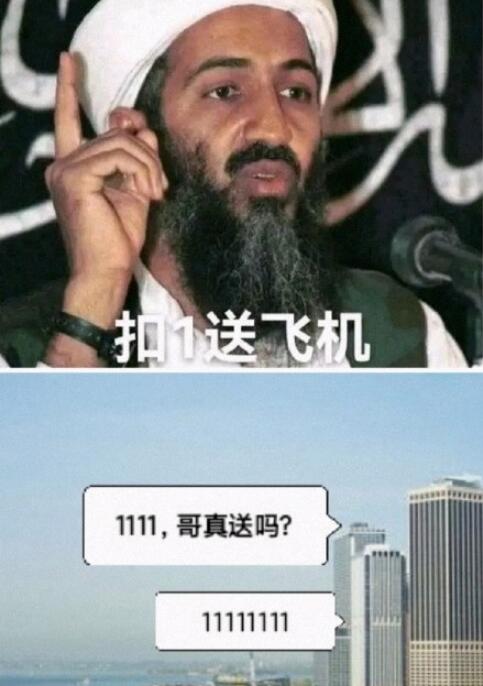 后来衍生出很多的扣1梗,其中以“扣1送飞机,世贸双子塔说111111,真送吗哥”最出名,扣1梗也正式进驻地狱笑话。
