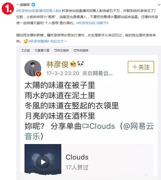 1、站姐说林彦俊微博文案抄袭,公共场合看剧本,十分钟了还是同一页。