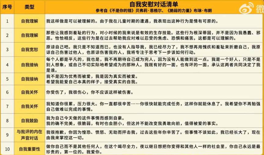 三,最后一个方法肯定是最有用的自我安慰策略,用自我对话的方式培养自我同理心。小5在这里整理了我最喜欢的十大对话清单,下次应激性自卑时不妨试试看,在脑海里默读。