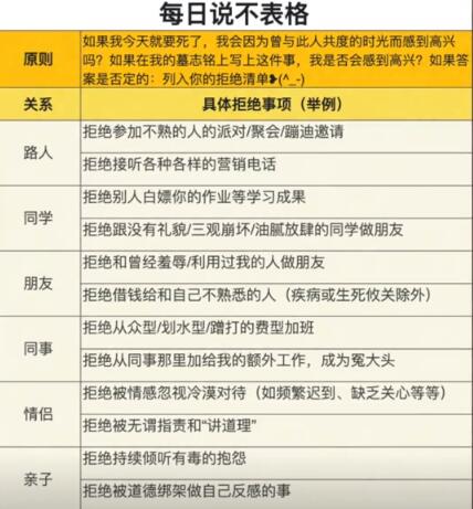 一、停止讨好他人,意识到你自己始终是第一位的,这不是自私,你可以对自己说,我有权利对任何人说不,我有权利做让自己快乐的事。关键是多做一些小时候还没有身心焦虑的时候,你会喜欢的事情。一个非常好的方式是尝试记录每日说不表格,拟一分给自己的享乐清单。别害怕别人会觉得你自私,因为经历过情感忽视的人想要自私起来真的挺难的