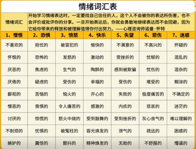二、停止封闭内心,给自己的情绪起一个名字,把他们表达给你在意的人。没有情绪就没有自我,恐惧是在告诉你该逃了,而生气是在告诉你这就不合理。下次感到自己有情绪的时候,就从这个表格里pic一个词汇来表达出来吧。