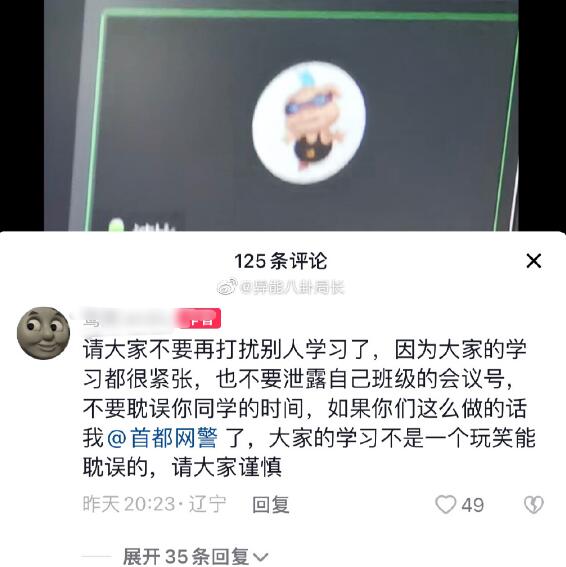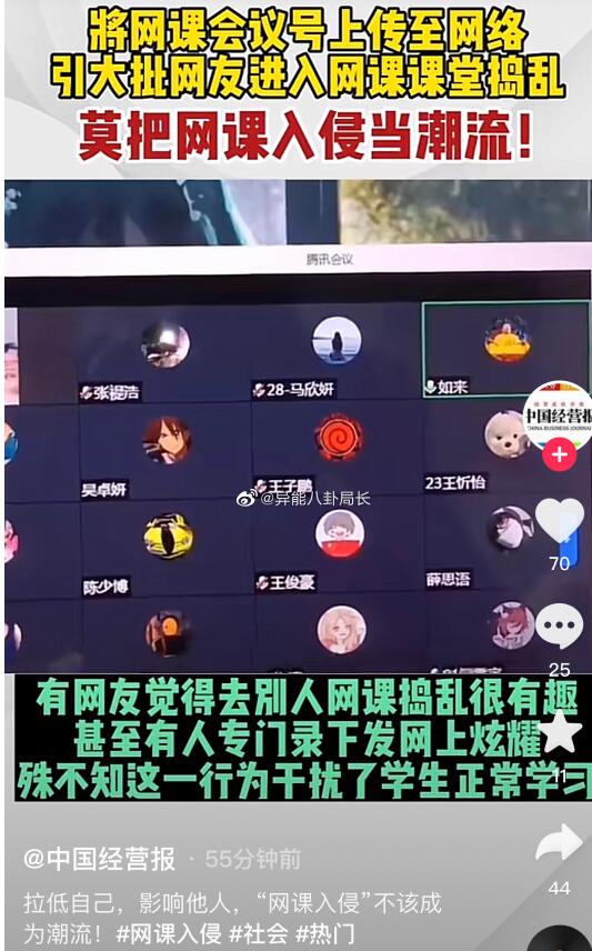 ![]() 有的学生自身开小号进行刷屏,有的学生是将网课的会议号分享给陌生人进来捣乱,甚至最后他们组织在一起,组成“网课爆破群”,称自己为“爆破手”,只要发了会议号,就会集体进去刷屏,将这种行为称为“网课入侵”,最后还将自己的行为引以为傲的发布出来。 ![]()
