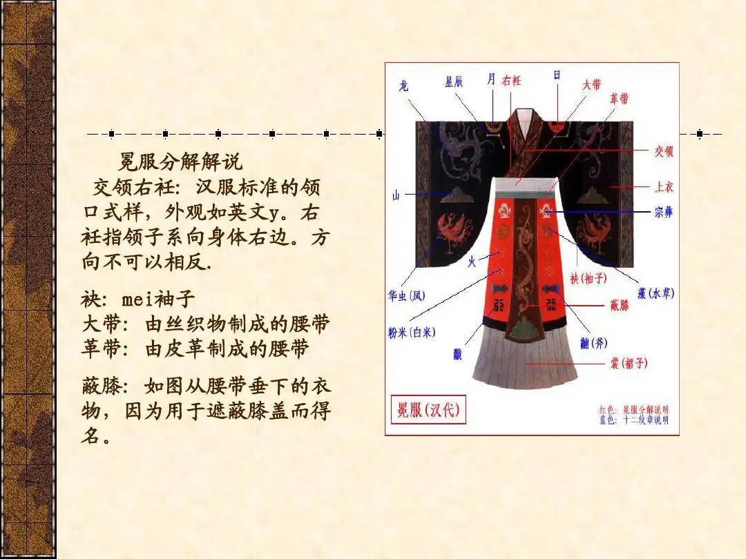 汉服最大的特点是“交领右衽”,及对襟,圆领。左衽和右衽不可乱穿,右为阴左为阳,交领呈“y”状为右衽,为生者服,反之左衽为逝者服。 ![]() |
