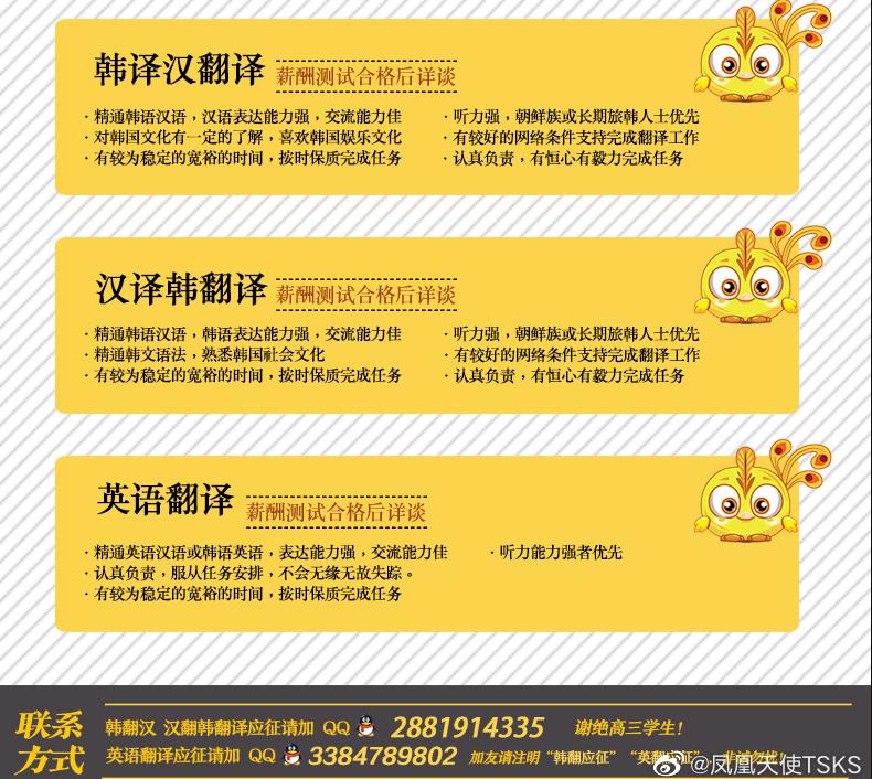 ![]() 凤凰天使即“TSKSCN”,上面有大量的海外剧的资源,并且都给翻译并加上了字幕,TSKS韩剧社致力制作优质的版权韩国剧集﹑韩国综艺及韩国电影,截止目前为止是全球华人最受喜爱的韩综韩剧字幕制作团体。 凤凰天使之所以如此成功,跟翻译组准确到位的翻译有很大的关系,根据凤凰天使的官方微博来看,他们持续在招翻译组,而并且一旦被招进翻译组,是有工资的。 对于韩语翻译招聘的要求是: