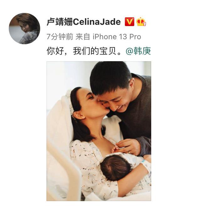 9月9日,韩庚、卢靖姗晒一家三口合照宣布女儿出生喜讯,配文:“你好,我们的宝贝。”照片中卢靖姗亲吻韩庚脸颊,韩庚则满脸笑容看着女儿,画面温馨。据工作人员透露,母女平安。据悉,2018年2月韩庚宣布与卢靖姗的恋情,2019年12月两人官宣结婚喜讯,2022年5月两人官宣怀孕。