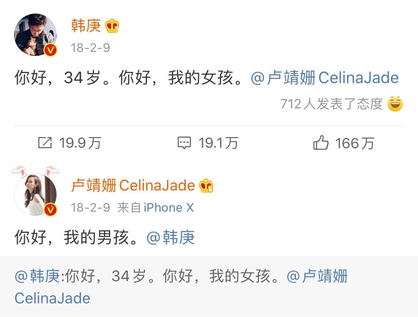 ![]() 网传韩庚和卢倩珊的相识是靠吴京牵线的,卢倩珊的工作人员表示,两个人是在2017年8月16日第31届中国电影金鸡奖典礼上认识的,当时他俩搭档颁奖,下楼梯时韩庚绅士地扶了卢靖姗,卢靖姗后来发文谢谢他,韩庚回复:“是我的荣幸~期待有机会合作”。之后,在吴京和谢楠的推波助澜下,两人迅速发展为情侣。 ![]() 2018年情人节两人用“你好,我的男孩(女孩)”来官宣恋情;2019年的你好,我的爱人官宣结婚,2019年最后一天,二人在新西兰举办婚礼。卢靖姗凭借主演《战狼2》、《李茶的姑妈》等电影获62.88亿票房。韩庚则凭借《前任3:再见前任》、《致我们终将逝去的青春》等电影,获44.59亿票房。实至名归的“百亿夫妇”。 ![]() |