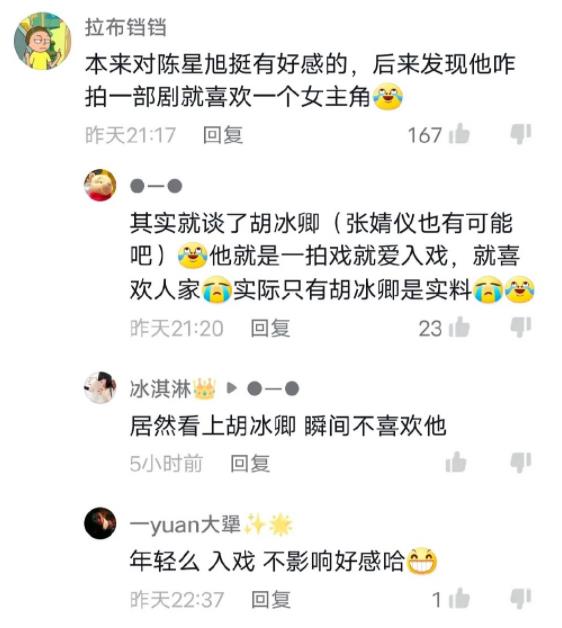 所谓:“陈星旭见一个爱一个”这个梗是在抖音上传出来的,当时在评论区有网友表示:“本来对陈星旭挺有好感的,后来发现他咋拍一部剧就喜欢一个女主角。”不过令人尴尬的是有一次合作了一部戏还传过绯闻,居然连人家名字都叫不上来,这是不是说明所谓的“恋爱瓜”极有可能只不过是剧组炒作CP,炒作剧的热度??