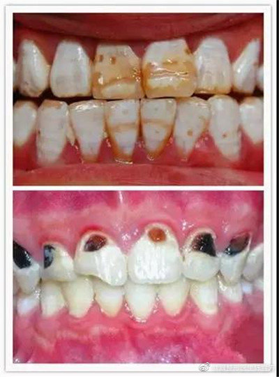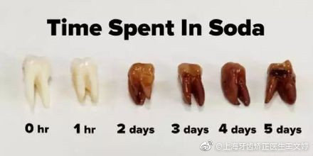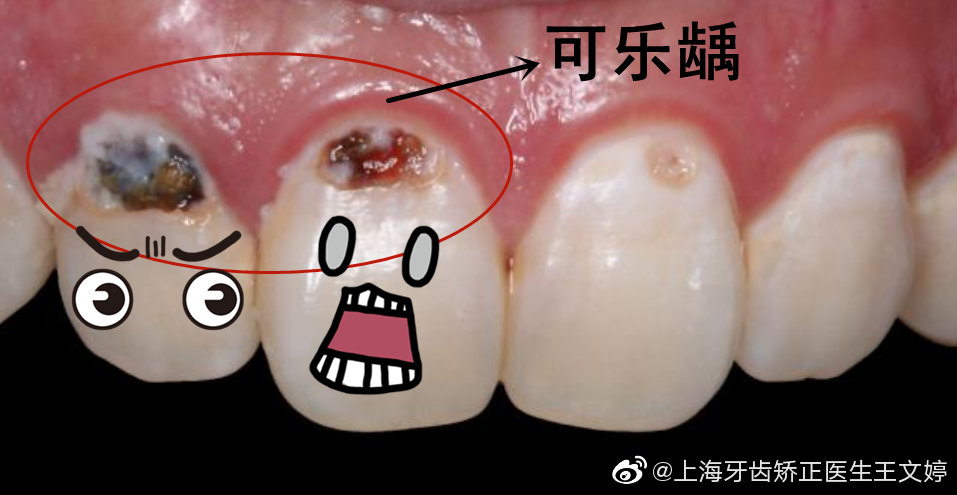 可乐牙长什么样子呢?给大家放一些图: ![]() 牙齿的主要成分为羟基磷酸钙,当频繁喝碳酸饮料,酸性物质作用于牙釉质,可以直接溶解牙齿中的矿物晶体。我们看“可乐牙”有一个明显的特征就是都从牙齿的根部(即牙龈处)开始腐烂。 ![]() 再来一个可乐牙的图,这种腐烂掉的地方也叫“可乐龋”。 ![]() 牙齿在可乐(碳酸饮料)中浸泡5天会发生什么变化呢?看下图 ![]() 那么如果得了可乐牙如何治疗呢?目前有2种方案,一个是树脂充填,一个是全瓷贴面。