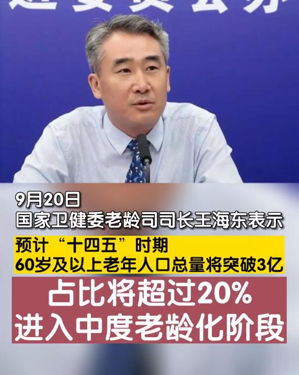 9月20日,国家卫健委老龄司司长王海东在党的十八大以来老龄工作进展与成效新闻发布会上表示,预计“十四五”时期,60岁及以上老年人口总量将突破3亿,占比将超过20%,进入中度老龄化阶段。2035年左右,60岁及以上老年人口将突破4亿,在总人口中的占比将超过30%,进入重度老龄化阶段。我们可以看到,只要60岁及以上的老人,在总人口中占比超过30%即进入重度老龄化阶段,也是重度老龄化社会的标准。