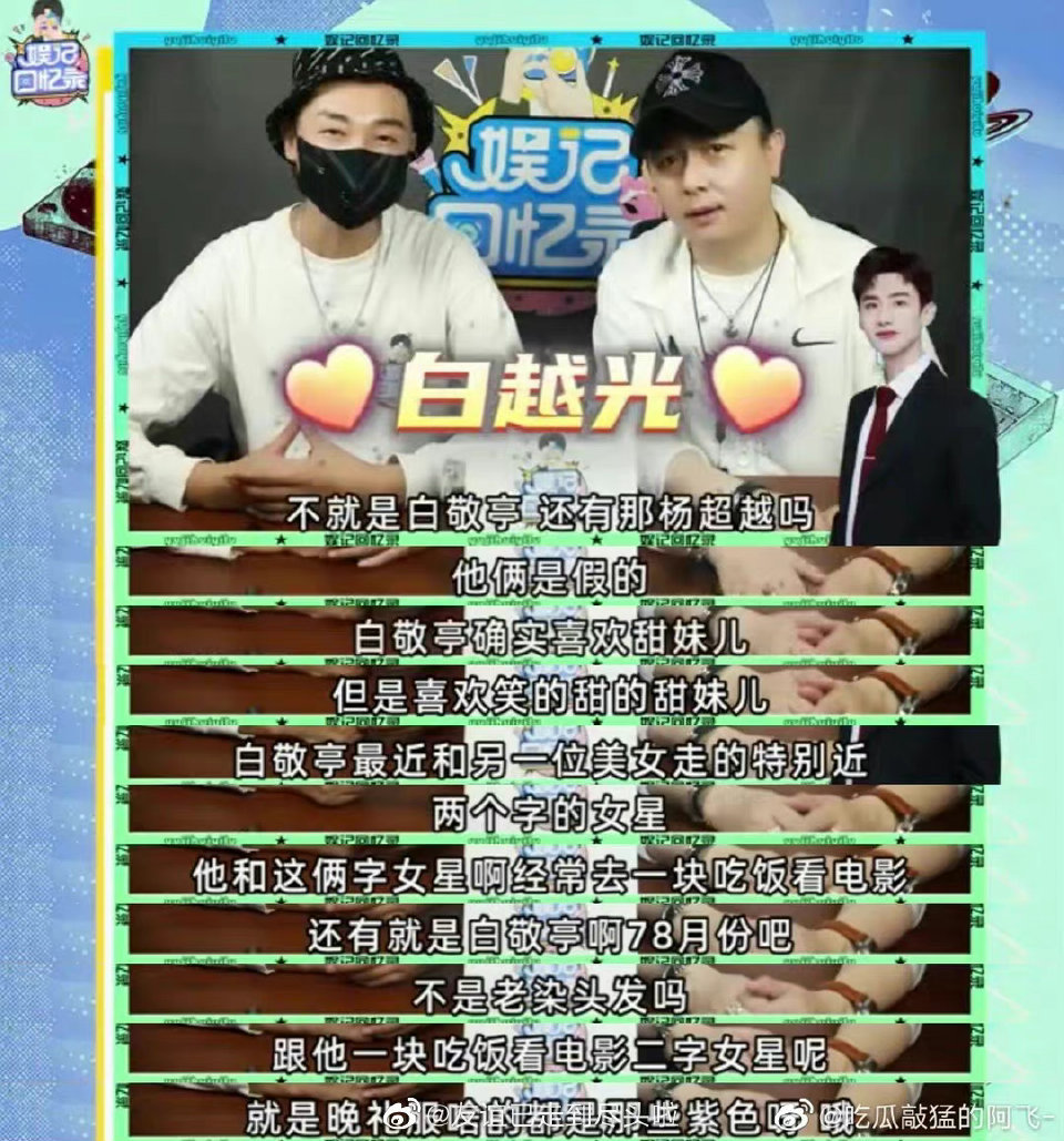 有狗仔爆料,白敬亭有喜欢的女生,而且还就是娱乐圈里的,名字是两个字,最近白敬亭正在追这位女明星,两人还经常一起吃饭,看电影。二字女星的特点是温婉,爱笑,穿的礼服是白敬亭头发的颜色。并且爆料杨超越和二字顶流关系好,甚至住在一个单元。娱乐圈在传他两恋爱。至于白敬亭和杨超越的白越光cp,那是假的。