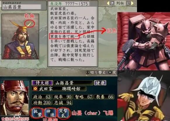 日本战国武将山县昌景因为在《太阁立志传》、《信长的野望》系列中常以身穿赤色具足、头戴有角的兜的形象登场,并且多数时候拥有加速类技能,所以也被称为“红有三”。