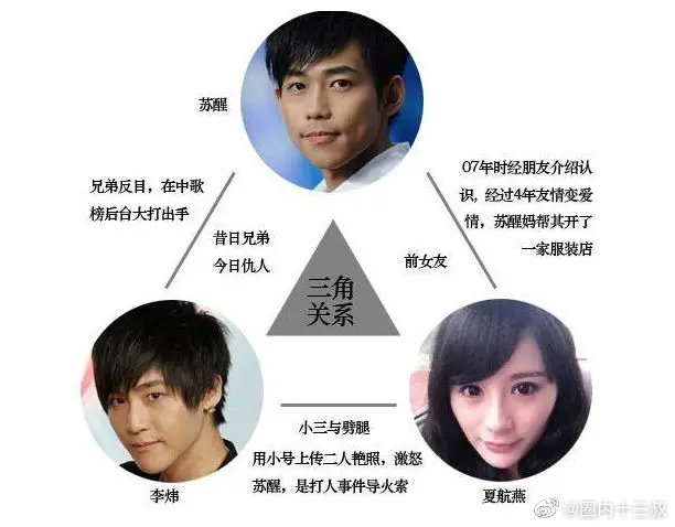 ![]() 苏醒还有一个非常有名的女友叫夏航燕,当年还发生过著名的“托nai门”事件,起因大约是苏醒将自己的女朋友交给李炜照顾,结果夏航燕和李炜出轨了。李炜拿了快男冠军后就和该女勾搭在一起了,李炜还用微博小号晒了手托女的胸自拍照,然后苏醒就在2012年12月29日台北演出活动的后台狂扁了李炜。结果两败俱伤,踏两船心机女得利。 ![]() |