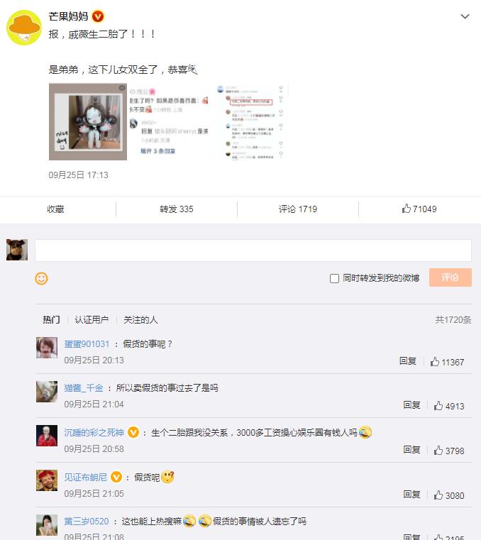 有消息透露说李承铉在哥哥录制现场透露戚薇二胎生了个男孩,戚薇在社交平台晒照配文“又一只”,如果是真实的那就恭喜恭喜了。不过这次生二胎事件曝光之后,我们看评论区送祝福的寥寥无几,反而是一股脑的都在问前段时间假货事件是怎么处理的。