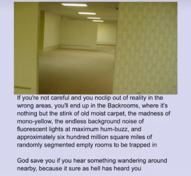 先举个不太恰当的例子,相信大家玩游戏时肯定出现过这种情况,有时会不合理的进入其他物体,这种属于游戏bug,俗称“穿模”。在“后室”的信奉者眼中,我们的现实世界就是一个正在运行的巨大程序,是程序就必然有bug,他们相信只要找到这个bug就可以掉落出现实世界来到“后室”,而“穿模”或者说卡bug,就是打开后室的钥匙。来到后室你需要做两件事情: