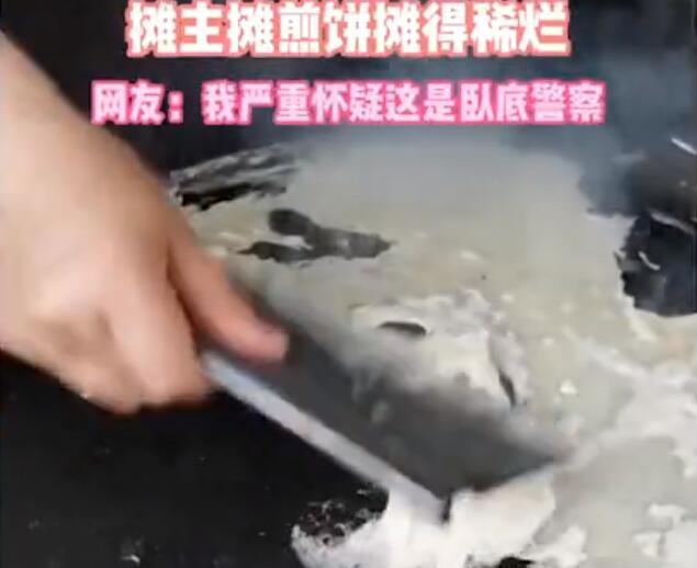 最后加多了的酱,以及新式煎饼的解释,还有开头摊主大哥钱让顾客看着给钱,这也太“合理”了,加之崭新的锅具、崭新的摊儿、还有更加崭新的老板,以及煎饼果子一定要切开的莫名的仪式感,这被网友怀疑是便衣警察在出任务摆的摊,很合理吧?