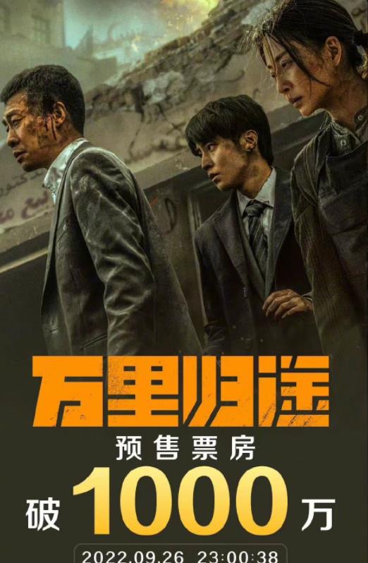 据灯塔专业版数据,电影《万里归途》预售票房已突破1000万大关!电影由饶晓志执导,张译、王俊凯、殷桃主演。本片定档9月30日全国上映,该剧是首部聚焦外交官撤侨的华语电影,9月26日首映礼看过的都说超好看!有欢笑,更有泪水,不强行煽情却让人忍不住流泪。《万里归途》的投资成本达到了3.5亿元,那么这部片的票房要达到10亿以上才不会亏本。这部剧的主要投资方是上海华策影视,据说光1:1的搭建非洲的城市,华策就花了3个亿,故事根据真实事件改编。北非努米亚爆发战乱,前驻地外交官宗大伟,与新闻司新人成朗受命前往协助撤侨。任务顺利结束,却得知还有一批被困同胞,正在白婳的带领下,前往边境撤离点。情急之下,两人放弃了回家机会,逆行进入战区。在撤侨的最后100公里,面对反叛军的枪口,穿越战火和荒漠,赤手空拳的外交官如何让125人走出一条回家之路……