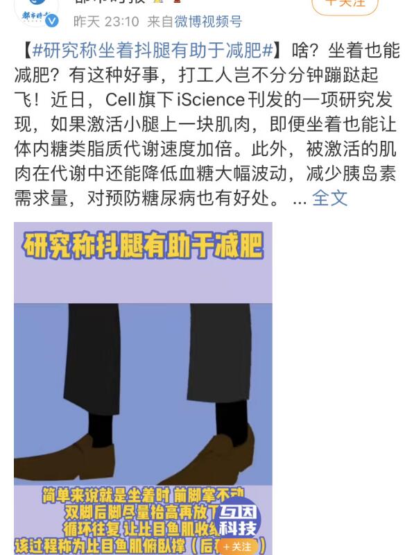 近日,有研究称“坐着抖腿有助于减肥”Cell旗下iScience刊发的一项研究发现,如果激活小腿上一块肌肉,即便坐着也能让体内糖类脂质代谢速度加倍。此外,被激活的肌肉在代谢中还能降低血糖大幅波动,减少胰岛素需求量,对预防糖尿病也有好处。