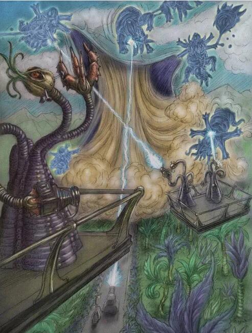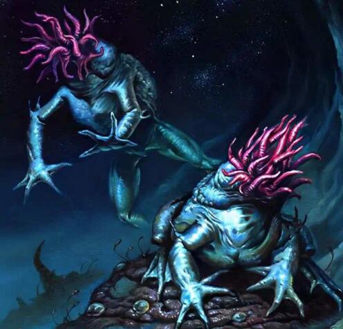 克苏鲁神秘生物-恐怖猎手 恐怖猎手(Hunting Horrors)是克苏鲁神话中的一类生物,由H.P.洛夫克拉夫特创造,初登场于《梦寻秘境卡达斯》。这是一种长着蝙蝠翅膀的长蛇形黑色生物,身形灵敏;有一些可能只有一只翅膀。它们是外神奈亚拉托提普的侍从,偶尔会出现在幻梦境中。奈亚拉托提普的一个化身,“The Haunter of the Dark”,与恐怖猎手有着相似的特征。 ![]() “在天空中飞翔的,是宛如毒蛇般的巨大生物。它有怪异而扭曲的头颅,以及长有巨大钩爪的附肢。它靠着像黑色胶皮一样的、可怕的巨大翅膀,轻易地漂浮在空中。” ——奥古斯特·威廉·德雷斯《暗黑仪式》 ![]() 奥古斯特·威廉·德雷斯在《暗黑仪式》对恐怖猎手进行了详细的描述。 这些生物的长相,就像是长着蝙蝠或雨伞一样的翅膀、身躯庞大的黑色巨蛇或巨虫,因为它们一直在不断扭曲、变化,所以很难看清其面貌。有些恐怖猎手可能只有一只翅膀,它们会用震耳欲聋的喉音讲话。体积巨大,其体长平均为40英尺。飞行时,恐怖猎手会缓慢而有节奏地拍打自己的翅膀,其不断摆动扭曲的身体和悬荡的头往往会暴露它们。据说它们的姿势会不断变更,不停地扭曲,伴随着叫声,所以很难看清它们。 ![]() 恐怖猎手会逃避阳光。如果遭到非常强烈的光照,它们甚至可能会枯萎、化成灰烬。它们的行动非常迅速,一般会为某些神(特别是奈亚拉托提普)当作猎犬使唤。但如果是与神格无关的召唤,就必须献上鲜血和生物以取悦它。 恐怖猎手是一种有智慧的生物,它们居住在一个黑暗的星球,但它们似乎没有社会结构或物质文明。 恐怖猎手可以通过法术(恐怖猎手召唤术,别名祈求飨宴之牙、召来扭曲恶魔的言语)被召唤,单只恐怖猎手将由头及身出现,好像从空间中开了一个洞出来一样。本法术只能在夜晚的户外施放。如果没有额外为束缚准备祭品,它会叼走施法者并消失。 克苏鲁神秘生物-月兽 月兽(Moon-Beast)出自克苏鲁神话里的下级独立种族,最早出现在H.P.洛夫克拉夫特,《秘境卡达斯梦寻记》,是一种具有高等智慧,头部的地方长的是一丛粉红色的触手,没有眼睛,并可以改变自己身体的形状的白色的蟾蜍形生物。 “它们有着灰白色的粘滑巨体,体积能自由地扩张、收缩。它们的形态——虽然经常改变——大致接近于无眼的蟾蜍,在那轮廓模糊的钝吻前端,生有一丛短小的、不断颤动的粉色触手。” ——H.P.洛夫克拉夫特,《秘境卡达斯梦寻记》 ![]() 月兽具有高等智慧。它们居住在幻梦境的月球的黑暗面,不同于现世的月球,幻梦境的月球上有大面积的森林和海洋。月兽仅仅以活物为食——从猎物的身体和灵魂中汲取一种特殊的物质作为食物。 月兽能适应多种气候与环境,适应能力极强,并能利用大量的技术知识来扩大自己的领域。它们的殖民地几乎在任何地方都可能发现。 月兽在月球与幻梦境之间进行奴隶贸易。在德拉斯-利恩港口(Dylath-Leen),它们以红宝石换取奴隶和黄金。在实际交易中,月兽会雇用以头巾作为掩饰的冷原原住民作为代理人,自己则藏在下方的隐藏甲板里。 ![]() 后来,德拉斯-利恩港口的商人们知道了这一秘密。月兽的奴隶来自宇宙的各个地方,不过大多数月兽喜欢选人类作为奴隶。月兽可能只在幻梦境有,或仅仅只是月兽的殖民地在幻梦境的发展远快于在现世的发展。 对阿波罗11号所拍摄的照片的研究表明在现世月球的背地面可能有一处月兽的殖民地。 月兽还会花费大量时间在拷打和折磨上,以此为消遣,从其他生物的痛苦中寻求鄙陋的欢乐。 ![]() 月兽侍奉着奈亚拉托提普,将其它种族当作奴隶。在某种意义上,它们是一个虐待狂种族;月兽非常残酷,会对抓到的异族生物严刑拷打。 作为它们使用的武器,这里只举矛作例子;但它们也有可能会使用各种令人震惊的武器。月兽多从事士兵的职业,被它们当作奴隶的种族多种多样,但以冷族的男性为主。
