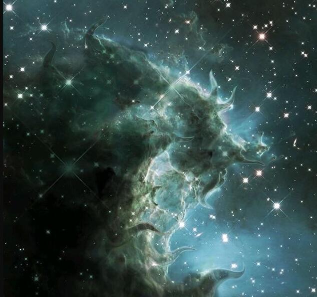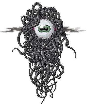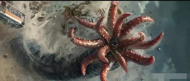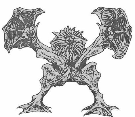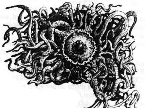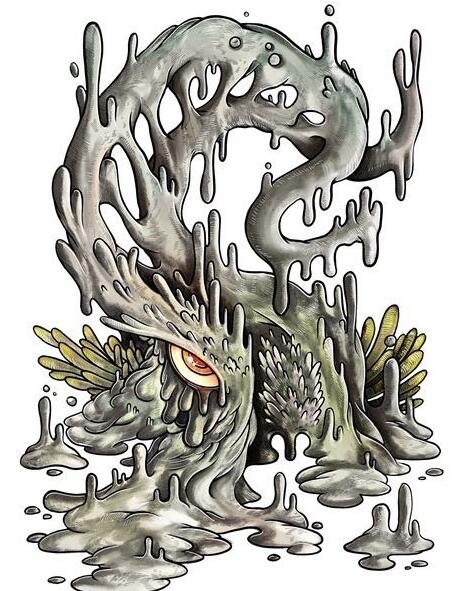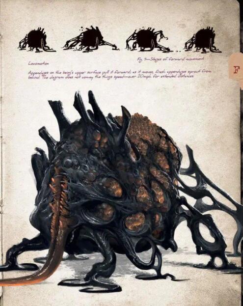 “这个双足怪物后肢类似于两栖类,前肢像恐吓一般高高举起,末端长着吸盘的带蹼手掌张开扑向观看者。它的头部是一大团沸腾的伪足或触手,其中可以分辨出一只闪耀的眼睛。”