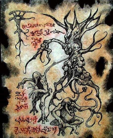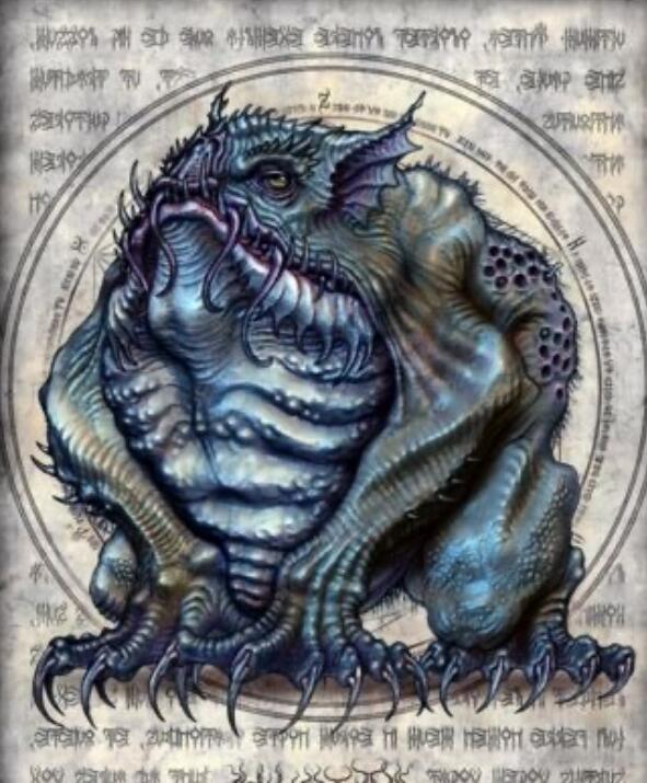 克苏鲁神秘生物-延达罗斯猎犬 廷达罗斯猎犬(英语:Hounds of Tindalos)是由弗兰克·贝尔纳普·朗创造的一种虚构生物,后来奥古斯特·德雷斯将其编纂进了克苏鲁神话。最早出现在朗发表于1929年3月的《诡丽幻谭》杂志上的短篇小说《廷达罗斯的猎犬》中。洛夫克拉夫特在他的短篇小说《暗夜呢喃》(1931年)中也有提及。 弗兰克·贝尔纳普的故事讲述了主角借助致幻剂和古代神器的力量进行时间旅行的实验,最终被廷达罗斯猎犬追杀的故事。 猎犬们居住在“角度”的时空中,与生活在“曲线”的时空中其他普通生命(如人类)不同。虽然因为这个令人联想的名字,画家有时会把廷达罗斯猎犬画成一种犬类动物。但实际上它们的外形不为人知,朗和洛夫克拉夫特都没有描述过它们的外形,因为“它们过于污秽,无法描述”。 它们又瘦又饥渴!’他尖叫着。……‘宇宙中所有的邪恶都集中在它们消瘦饥渴的身体里。话说回来,它们有身体吗——我只看了它们一瞬间;我不能肯定。’ ——F·贝尔克纳普·朗,《廷达罗斯猎犬》 ![]() 朗的故事中说,名字“掩盖了它们本质的污秽 ”。它们有中空的长舌头,用于吸干受害者的体液,还会排出一种怪异发臭的蓝色黏液。它们能在房间角落等有“角度”(小于120度)的场所实体化。当廷达洛斯猎犬出现的时候,首先会在房间的角落冒出烟雾,然后从烟雾中出现猎犬的头部,接着是整个身体。只要一个人进行过时间旅行,猎犬就可能注意到他,对他穷追不舍。 对于被它们盯上的人类而言,或许消除屋内所有的方角是躲避的一个办法,但似乎没有人真正成功过。而如果普通人类试图通过某些禁断的秘法进行时间旅行时,就有极大的可能遭遇廷达罗斯之猎犬。 “是的,我说的正是廷达罗斯猎犬,那些来自远方的猎人,它们是诺斯·意迪克的后代,库苏恩的恶臭,它们在那可怕的阿撒托斯的漩涡中永远嚎叫。是的,它们正是恶魔苏丹的仆从和奴隶,在它们令人恐惧的父母之下,诺斯·意迪克与可怕的库苏恩。” ——林·卡特《疯狂的时间》 ![]() 据林·卡特描述,廷达罗斯猎犬是外神诺斯·意迪克(Noth-Yidik)与库苏恩(K'thun)后代。在林·卡特的作品《疯狂的时间》(The Madness Out Of Time)中提到,诺斯·意迪克与库苏恩以一种特殊的方式结合创造了廷达罗斯猎犬。不过这个种族有着与它们的父母截然不同的外表及能力,无人知晓它们为何会出现在角状时间之中。 在布鲁斯·巴隆所著的《野性狩猎》(The wild hunt)中,廷达罗斯猎犬来自于一座存在于常规时空之外的城市廷达罗斯城(Tindalos),在那里它们被一个称作姆西斯哈(Mh'ithrha)的强大存在统治着。 ![]() 廷达罗斯之城以及城中扭曲的螺旋高塔现在已经被世界遗忘了。古代文献中描述这座城市存在于地球,但也有说法称宏伟之庭达罗斯坐落于(并且可能仍然在)银河系中一处遥远的虚空深渊(可能是一个黑洞)附近。流言蜚语中提到了把廷达罗斯的猎犬这个概念带到世界上的邪恶魔法和诡异科学,以及它们的创造者的最终毁灭。 克苏鲁神秘生物-黑山羊幼仔 路上有一个黑色的东西。不是树,是一个又大又黑的东西,就那么蹲坐在那儿,好像在等待什么,绳子似的胳膊蠕动着,伸展着……它是我梦见的那个黑色的东西——那个在树林里出现的,黑色的、有好多绳子的、粘粘乎乎的、像树似的东西。它爬了上来,用它的蹄子和嘴和像蛇似的胳膊,在地上蠕动着爬了上来。” ——罗伯特·布洛克,《弃屋中的笔记本》 ![]() 这种生物的躯体是一个巨大的团块,在团块上生着黑色的鞭状触手。团块周遭还张着巨大的嘴,从嘴里不断滴下绿色的粘液。在它的身体下方,还长着巨大的蹄子,它可以借此站立。 它的身躯轮廓就像是某种树木:粗短的脚是树干、长满触手的身躯是树冠。从它体内,散发出一种仿佛挖开了墓穴一样的恶臭。其身高在12到20英尺之间。 黑山羊幼仔指的就是莎布·尼古拉丝的尊号“孕育万千子种的森之黑山羊”中的“子种”。即,黑山羊幼仔与莎布·尼古拉丝之间有着极为密切的关系,也只有在崇拜莎布·尼古拉丝的地区才能见到它。 黑山羊幼仔有着聪明且喜欢独行。它们以闯入自己触角的倒霉生物的体液和内脏为食。它们喜欢静静地等待猎物自己落入陷阱,在享用完后便换一个地方重复这样的狩猎模式。不过在非常饥饿的情况下,它们也是会追踪和猎杀受害者的。 召唤他们的一种方法是在《迪詹之书》中找到相关法术并需要血液来献祭。仪式只能在月亮最黑暗的林地深处进行,受害者必须在石坛上牺牲。 它们作为莎布·尼古拉丝的代理者而行动、接受献给她的牺牲、代替她被信徒崇拜,并且吃掉不敬拜她的人,将母亲的福音向世界各地传播出去。幸运的是,它们相当罕见。 任何上位种族对于人类来说都是致命的危险,尤其是黑山羊幼仔。在漫画《overlord》中,安兹召唤的黑山羊幼仔几乎毫不费力地覆灭了人类军队。地球上的武器几乎无法对其造成伤害,如果不幸遭遇,如果还有机会的话请尽快逃离...... 克苏鲁神秘生物-修格斯 那可怕的,无法描述的东西,比任何地铁列车都要庞大。一团无定形的原生质肿泡,隐隐约约放着微光。上万只放出绿光,脓液似的眼睛不断在它的表面形成又分解。那填满整个隧道的躯体前端向我们直扑下来,把慌乱之中的企鹅们尽数压碎,在那已经由它和同类们“清理”得不留一粒灰