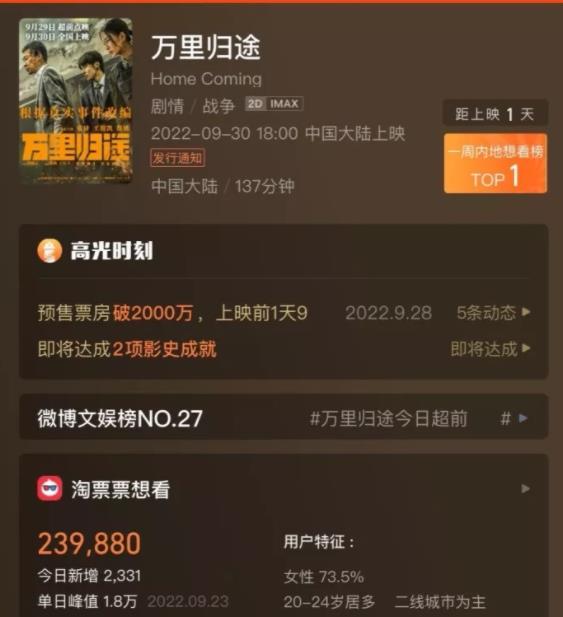据灯塔专业版数据,电影《万里归途》点映场总票房已突破500万大关,全国43城点映将于今日正式开启!所谓的电影点映,是指影片上映前小规模播放电影,其目的宣传电影、测试电影前期宣传效果,以及观众的反应情况,为后期的排片等做好准备。“点映”就像是餐馆新开张试吃,酒店新营业试睡。点映后,很多网友会在网络上发表自己的观影体会,这也会其他观众是否观看影片提供依据。
